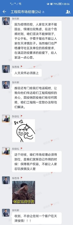 “于公于私,于情于理,也不能讓人家在天津餓肚子。”工程院市場(chǎng)經(jīng)理張利彬在和自己所負責的客戶(hù)溝通之后,在群里發(fā)了這句話(huà),當即一呼百應。“我的客戶(hù)我來(lái)護”!疫情之下,首先要保證的就是大家的健康問(wèn)題。此前,工程院迅速刊發(fā)在疫情期間的“致客戶(hù)書(shū)”,隨后梳理了滯留客戶(hù)的相關(guān)信息并立即開(kāi)展點(diǎn)對點(diǎn)對接工作,一一詢(xún)問(wèn)他們的狀況,聯(lián)動(dòng)中心后勤保障部,在疫情防控允許的范圍內解決客戶(hù)的需要。