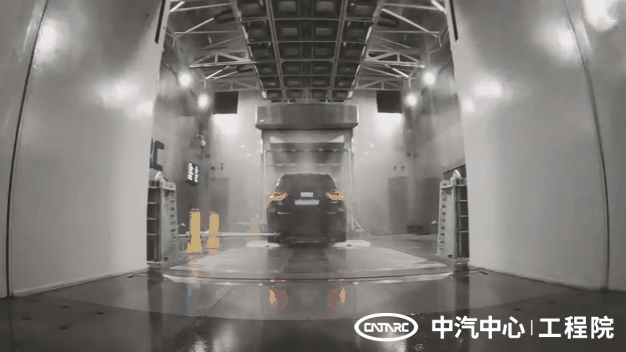 圖-中汽中心工程院環(huán)境風(fēng)洞,正在進(jìn)行汽車(chē)雨水試驗