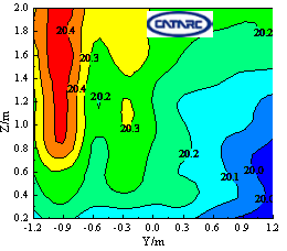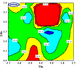圖3 距環(huán)境風(fēng)洞噴口和環(huán)境艙風(fēng)機出口1m處溫度分布(目標溫度25℃和20℃)