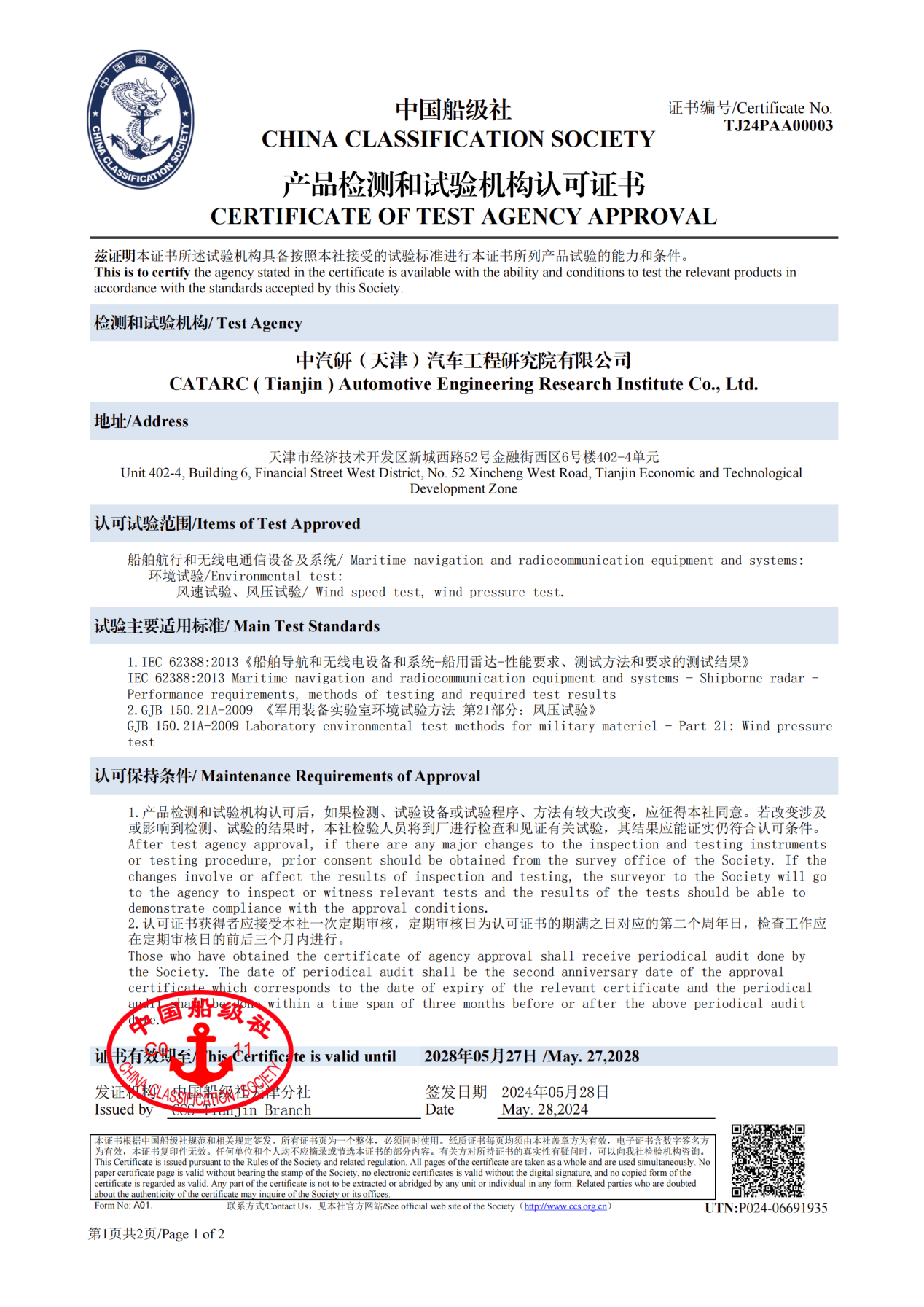2024年5月28日,由中汽研(天津)汽車(chē)工程研究院有限公司(簡(jiǎn)稱(chēng)“中汽中心工程院”)申報的“船舶航行和無(wú)線(xiàn)電通信設備及系統的風(fēng)速試驗、風(fēng)壓試驗”認可申請正式獲得中國船級社批準,并順利獲得“產(chǎn)品檢測和試驗機構認可證書(shū)”。工程院正式成為擁有開(kāi)展IEC 62388:2013《船舶導航和無(wú)線(xiàn)電設備和系統-船用雷達-性能要求、測試方法和要求的測試結果》、GJB 150.21A-2009 《軍用裝備實(shí)驗室環(huán)境試驗方法 第21部分:風(fēng)壓試驗》測試的第三方檢測機構。