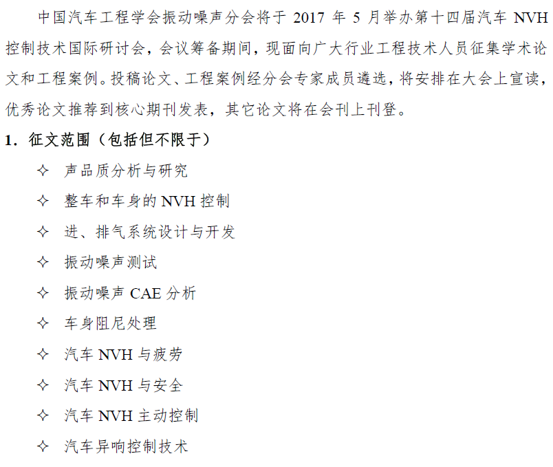 2017汽車(chē)NVH控制技術(shù)國際研討會(huì )征文啟事